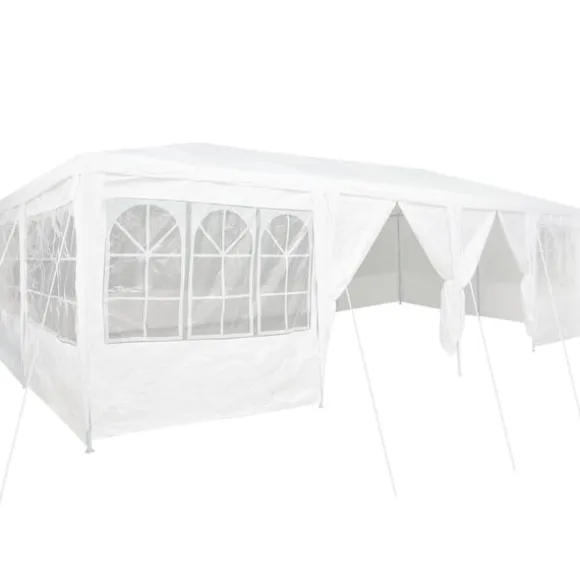 - Kvalitetsmaterial: Det här partytältet är gjort av hållbar polyetenväv som är både UV- och vattentålig, vilket ger dig ett pålitligt skydd i alla väder. Galvaniserade stålrör ger en stabil bas och hindrar tältet från att svaja även i blåst. Dessa funktioner säkerställer att ditt evenemang håller sig lugnt och tryggt.