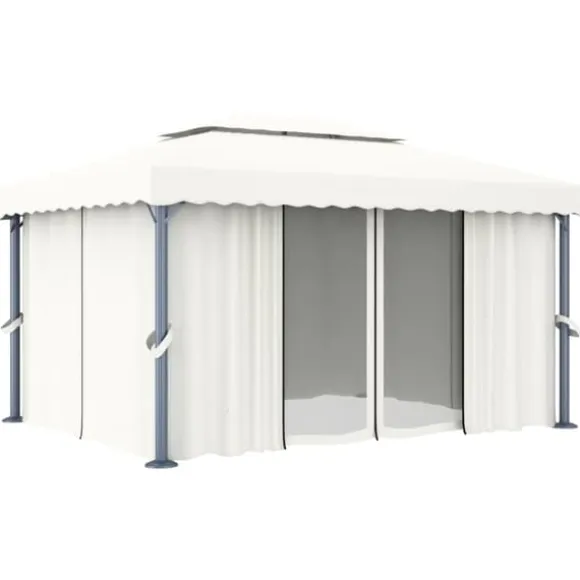 Den är utformad för att ge dig en sval plats för trädgårdsfester, familjepicknickar, grillfester och andra sammankomster. Den är tillverkad med aluminiumstolpar och stödstänger i pulverlackerat stål som säkerställer överlägsen stadighet och hållbarhet. Taket och sidoväggarna är tillverkade i högkvalitativt polyestertyg med PA-beläggning som skyddar dig mot skadliga solstrålar och lätt regn. Ett väldesignat tak i 2 våningar säkerställer bra luftflöde undertill. Dessutom ingår draperier och nätskärmar som ger dig insynsskydd samtidigt som det skyddar mot störiga myggor och andra insekter. Fästen med kardborreband ingår för enkel fastsättning.