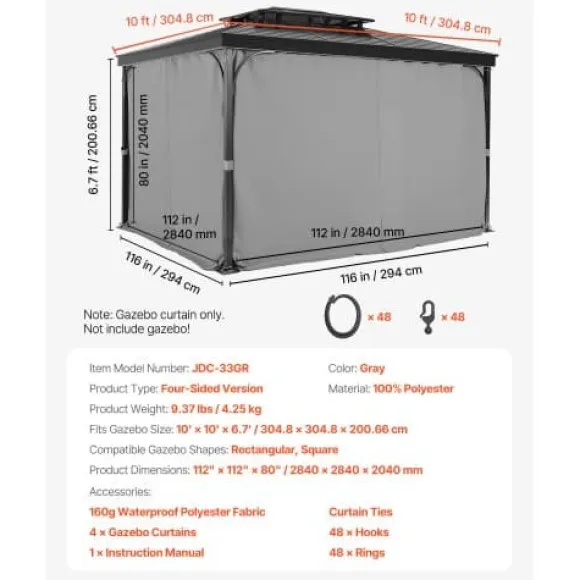Förbättra din utomhusmiljö med dessa hållbara paviljonggardiner, designade för att ge avskildhet och skydd mot väder och vind. Tillverkade av högkvalitativt vattentätt polyester, har dessa gardiner dubbelsidiga dragkedjor för enkel åtkomst och säkra aluminiumöljetter för smidig montering. Perfekta för altantak, de skapar en bekväm och privat miljö för avkoppling eller umgänge utomhus.
