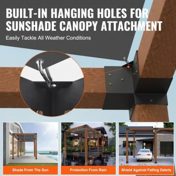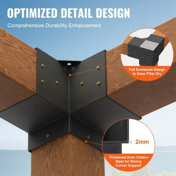 15 x 15 cm Tre-vägs Pergola-fästen: Detta hållbara och robusta pergola-fästeset skyddar träbalkar och förhindrar att de ruttnar av regnvatten och starkt solsken. Det är designat för vanliga 15 x 15 cm-specifikationer och kan hantera faktiska mått på 142 x 142 mm för både mjuk- och hårdträ.