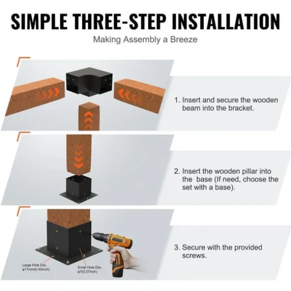 Komplett set: Levereras med 4 stålpergola-fästen och 80 skruvar. Klipp bara träet till önskad längd, sätt in det i fästena och dra åt, och fäst den sammanbyggda strukturen med trästolpar vid basen. Enkel montering, lämplig för både gör-det-själv-entusiaster och proffs.