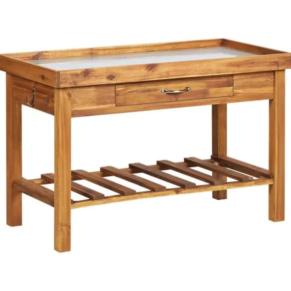Planteringsbordet i trä är tillverkat av massivt akaciaträ med en arbetsyta i zink, som är hållbart och stabilt. Det har en naturlig finish som kan målas eller betsas. Längst ner finns dessutom en förvaringshylla som ger dig massor av plats att förvara odlingsjord, krukor, handredskap, vattenkannor med mera.