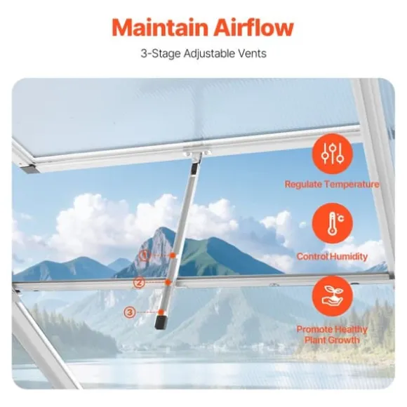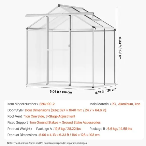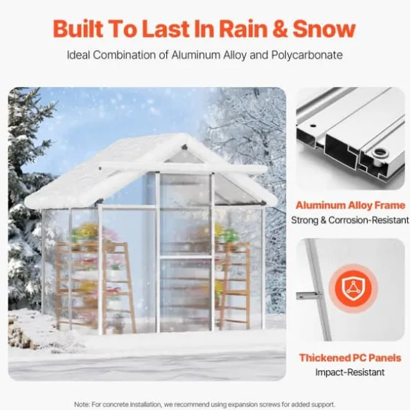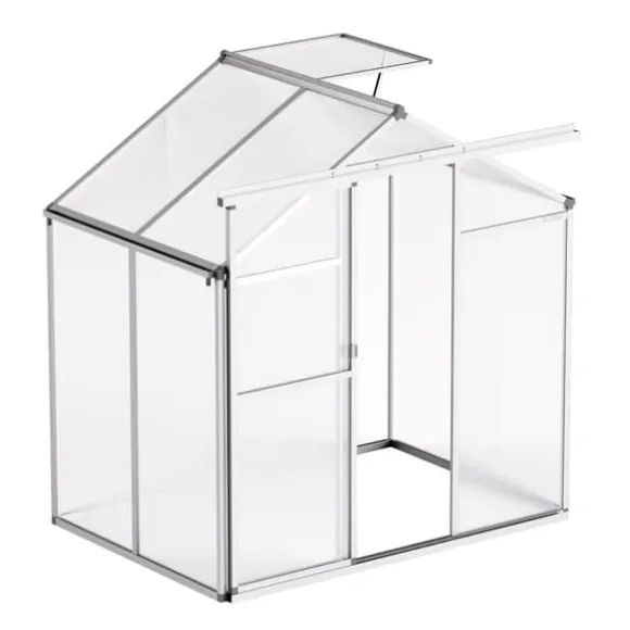 Det här växthuset är skapat för att hålla, tillverkat med en aluminiumram och polykarbonatpaneler som står emot korrosion och stötar. Panelerna är UV-beständiga och fungerar bra i olika temperaturer. Anpassat för olika väderförhållanden och förstärkt med stavar för att stå emot vind.