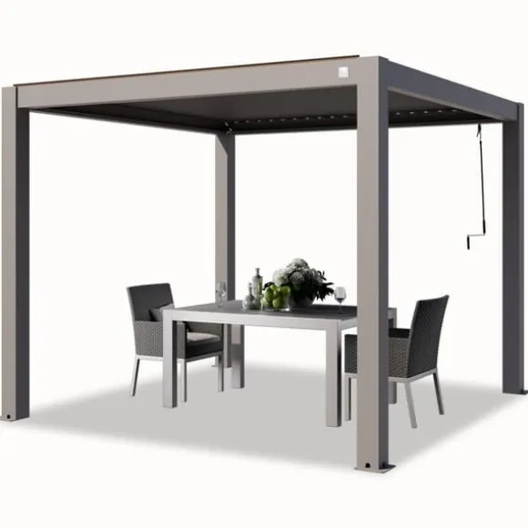 Robusthet möter elegans med denna lyxiga pergola. Den rostfria och extremt solida aluminiumkonstruktionen skyddar mot väder och vind året runt. Tack vare det praktiska vevhandtaget kan taklamellerna justeras flexibelt när som helst – utan att mekanismen är synlig. En pergola med minimalistisk look som kombinerar komfort med funktionalitet – oavsett om den är fristående eller fäst vid en byggnad.