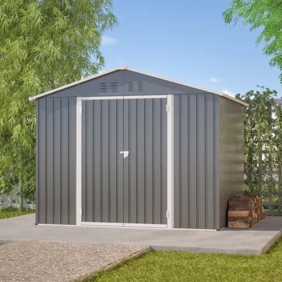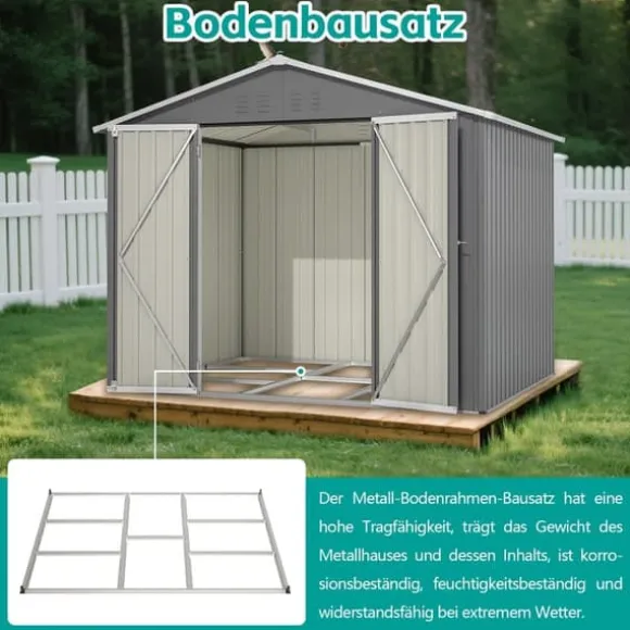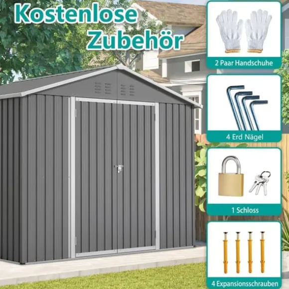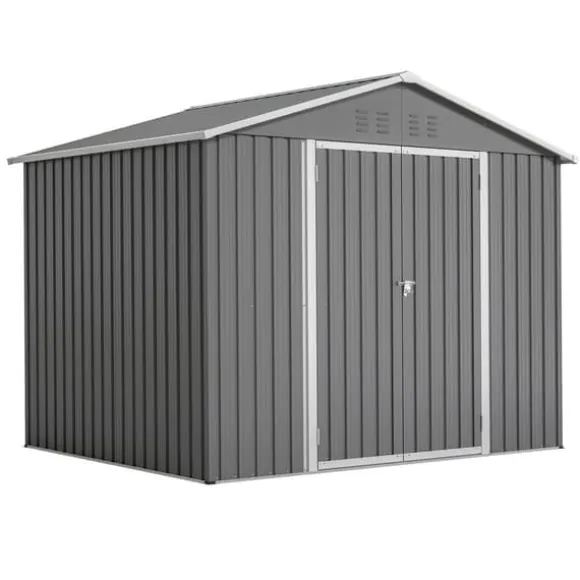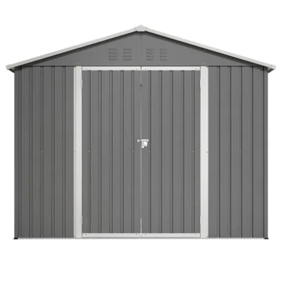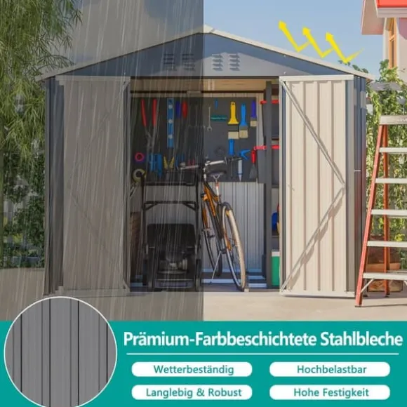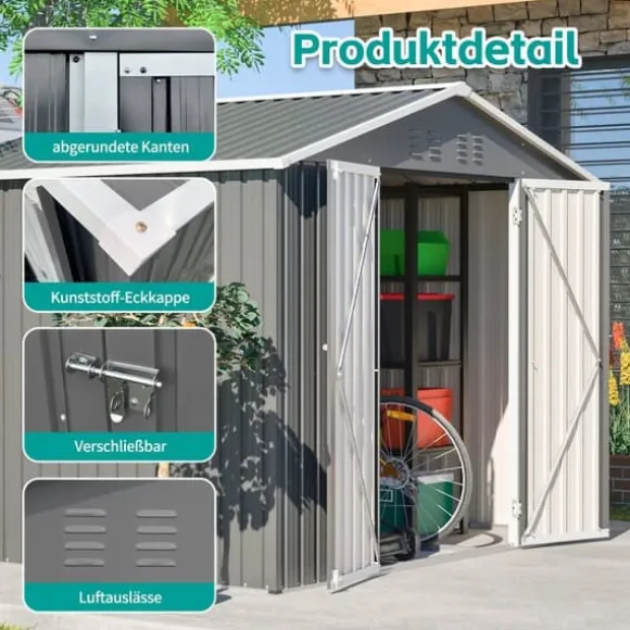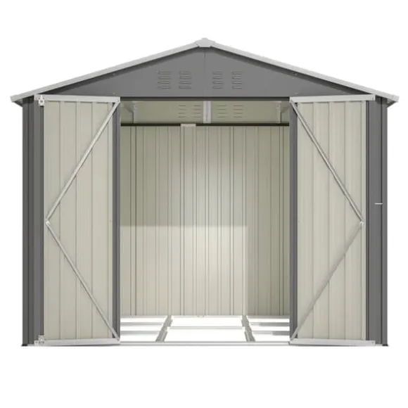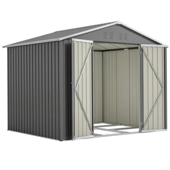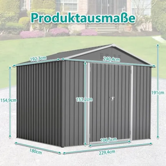 Rymlig redskapsbod i metall (8×6 ft) i antracitgrå för säker förvaring av trädgårdsredskap, cyklar och verktyg. Den robusta metallkonstruktionen är väderbeständig och rosttålig, medan den stabila bottenramen ger tryggt stöd. Vikdörr på 106 cm gör det lätt att köra in större föremål. Integrerade ventilationsöppningar förbättrar luftcirkulationen och motverkar kondens och lukt. Dörren kan förses med hänglås för ökad säkerhet (hänglås ingår ej).
