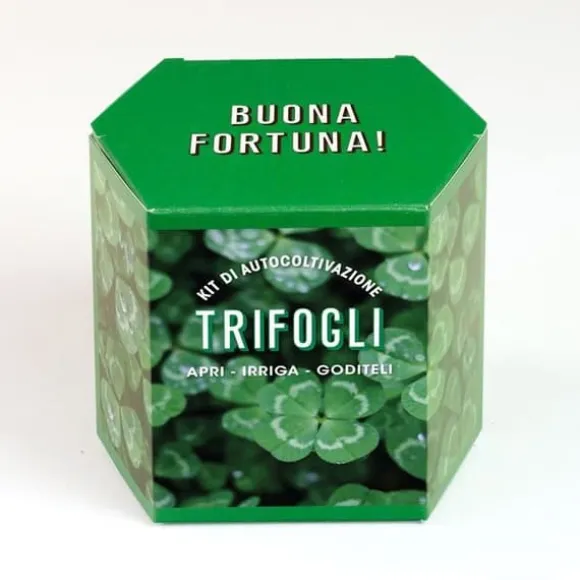 Kit för självodling av klöver Klöver är en perenn örtartad växt som når en höjd av 10 cm med globformade blommor i vit färg. Den har tre blad eller småblad i grön färg med vita fläckar, men på grund av en mutation kan den utveckla 4 blad, en symbol för tur sedan antiken. Varje av de 4 bladen representerar hopp, kärlek, rikedom och lycka. En del legender säger att det bästa sättet att attrahera tur är att förvara den mellan sidorna i en bok. Varje kit innehåller allt som behövs för att odla klöver: 1 100% biologiskt nedbrytbar såkruka, 1 torvtablett, klöversäd och 1 kort med vårdinstruktioner.