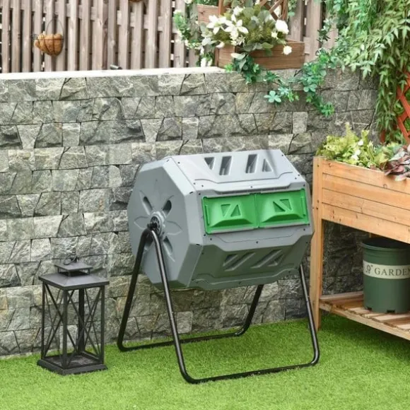 Tack vare denna Rootz kompostbehållare kan du göra kompost på ett naturligt och effektivt sätt. Den har två kammare: den färdiga komposten lagras på ena sidan och avfallet för att göra trädgårdsgödseln fylls i på den andra sidan. Den är gjord av plast, så den är väldigt robust och väl lämpad för utomhusbruk. Metallramen ger behållaren ett stabilt stativ. Kroppen roterar för att blanda allt utan att använda händerna. Trädgårdshandskar ingår.