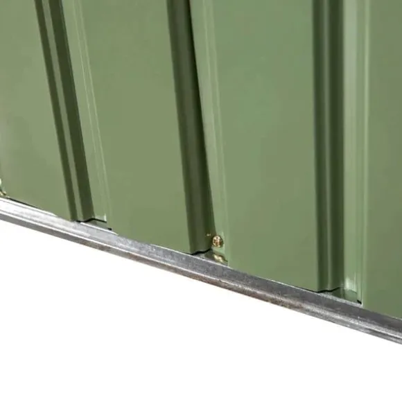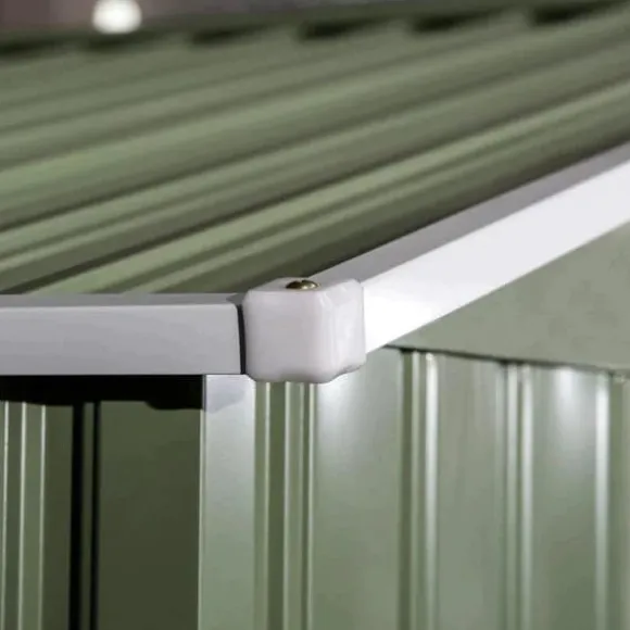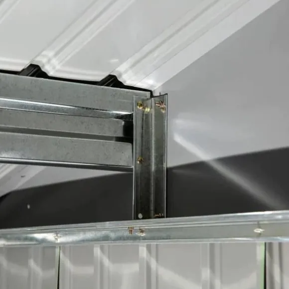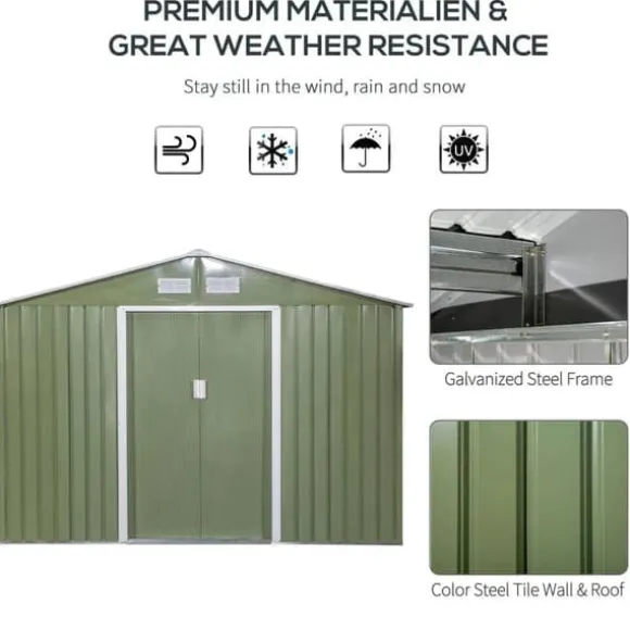 Lutande tak: Låter vattnet rulla ner till marken, vilket förhindrar uppbyggnad, stagnation och rostskador. DUBBELDÖRRSKID: Ger enkel åtkomst till trädgårdsskjul i metall med bas inuti och håller allt borta från grannar etc.