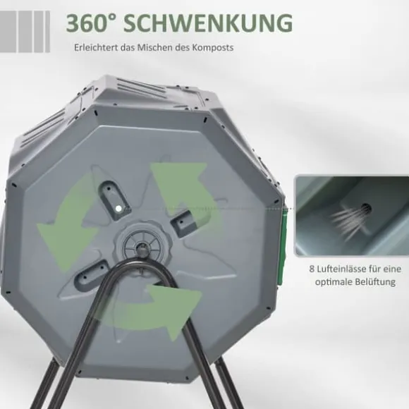 – Utmärkt ventilationssystem: 160 liters kompostbehållare med 8 ventilationshål på varje sida av trumman, som främjar luftcirkulationen och leder bort förbrukad luft och vatten.