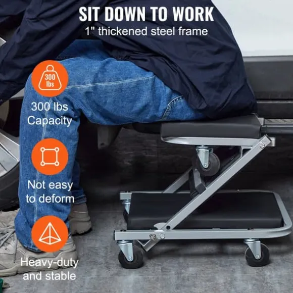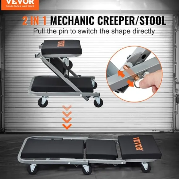 - mångsidig funktionalitet: förvandlas snabbt från en krabb avsedd för att glida under fordon till en pall för bekväm sittning på lägre höjder.