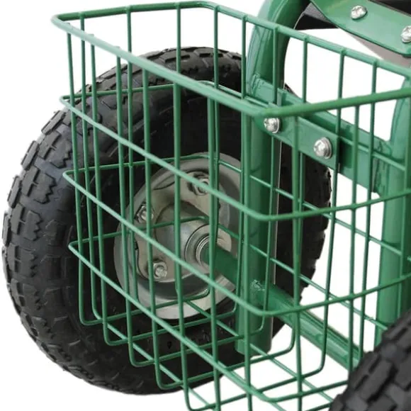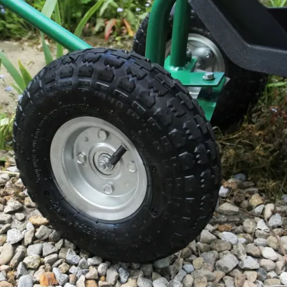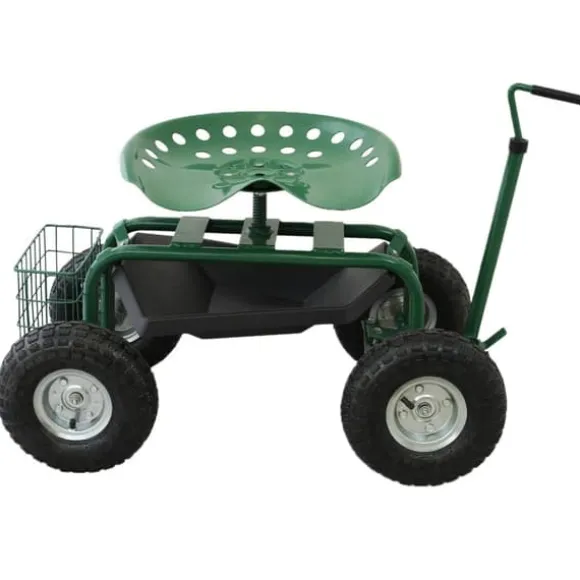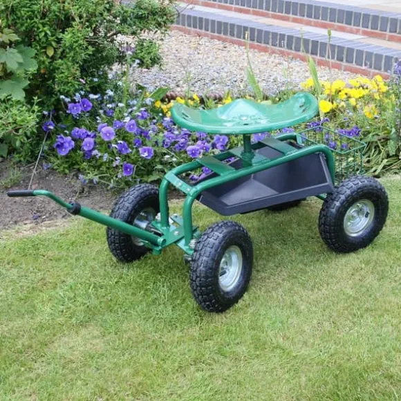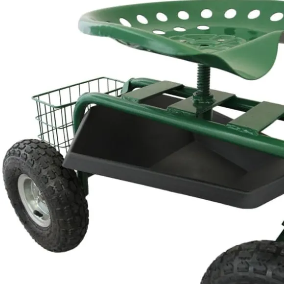 Trimma dina buskar med lätthet med den bekväma 360° svängbara sitsen med justerbar höjd! De pneumatiska däcken säkerställer en jämn åktur, medan handtaget fram gör det enkelt att manövrera runt i trädgården.
