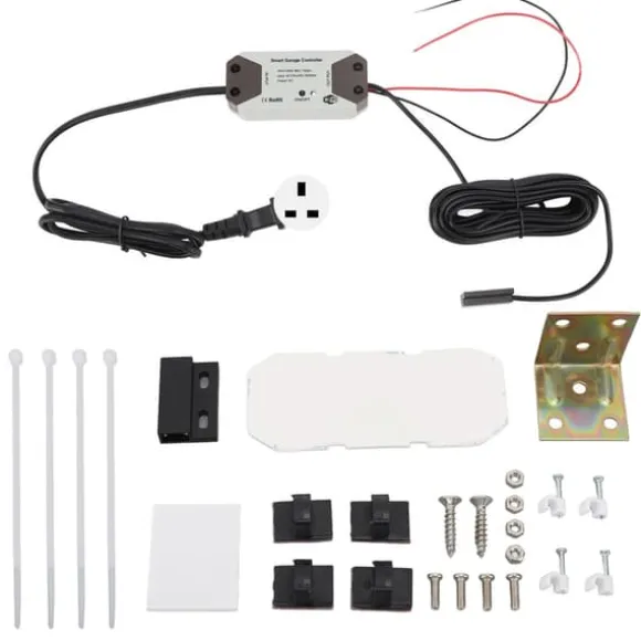 Med mobiltelefonens fjärrkontrollfunktion kan du öppna garageporten direkt utan att behöva kliva ut ur bilen, vilket sparar tid och energi. Smart Garage Controller levereras med en komplett uppsättning tillbehör för enkel installation, inklusive buntband, tejp, lim, självhäftande krokar, skruvar, muttrar, väggspikar, en sensor och en vinkelstag.