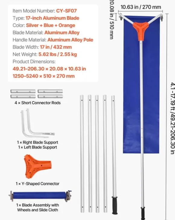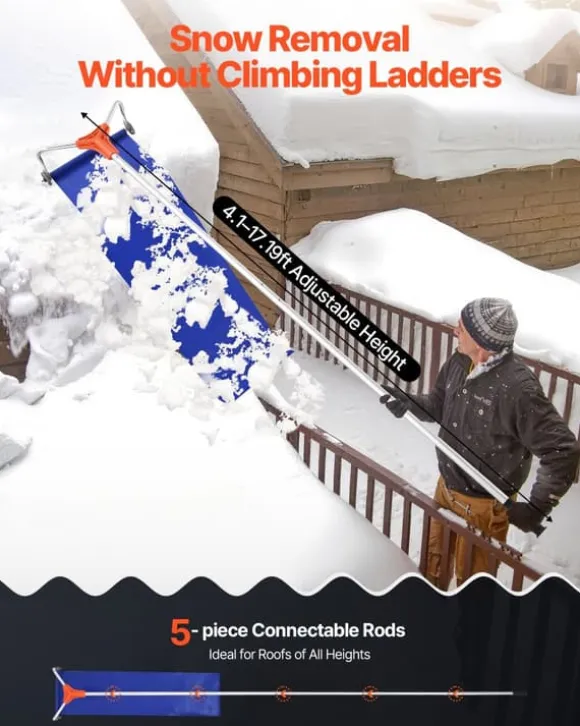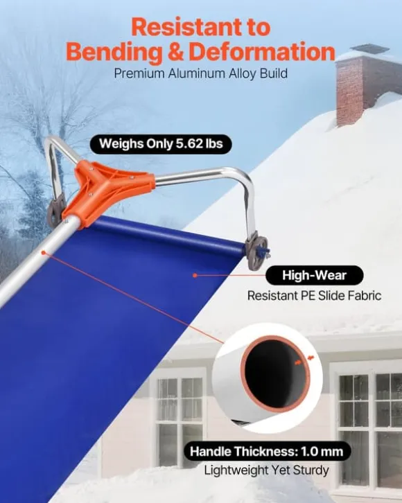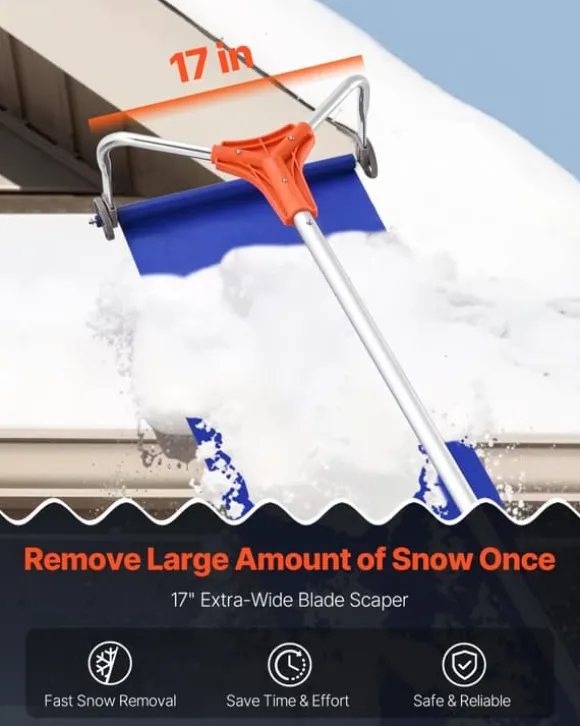 Effektiv taksnöröjning med extra brett aluminiumblad, justerbart skaft och lättrullande hjul – byggt för stora ytor och skonsamt mot taket.