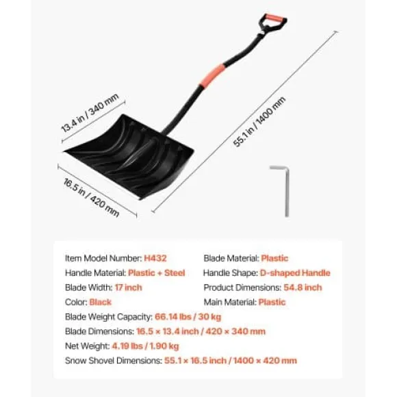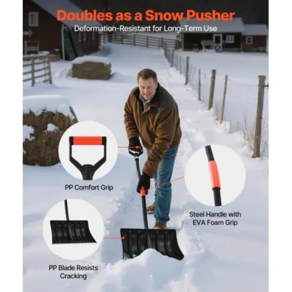 Den här snöskyffeln är utformad för effektiv och bekväm snöskottning av uppfarter, gångvägar och utomhusytor. Det breda, hållbara bladet och det ergonomiska handtaget gör det snabbt och enkelt att ta bort både torr och blöt snö, medan den lätta designen säkerställer portabilitet för användning hemma, i trädgården eller på campingresor. Byggd för långvarig prestanda, är det ett praktiskt verktyg för en mängd olika utomhusuppgifter.