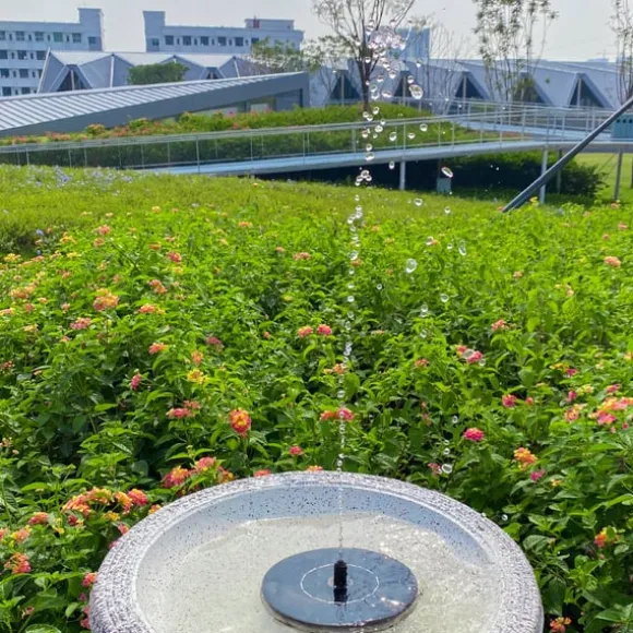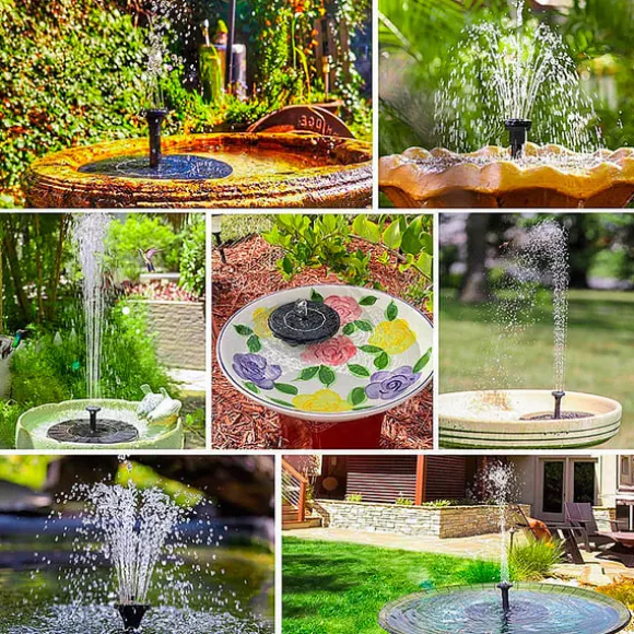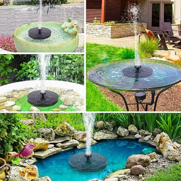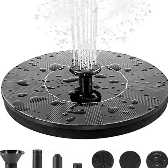 Solcellsdriven drift: Utrustad med en solpanel med en enda kristall kiseldropplim, fungerar denna fontän på solenergi. Solpanelen har en märkspänning på 6V, märkeffekt på 1W och arbetar med en spänning på DC 4,5-12V. Vattensprayhöjd på 30-50cm. Olika fontänmunstycken kan anslutas för att uppnå varierande vattenspruthöjder.