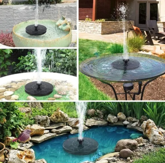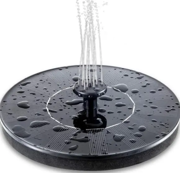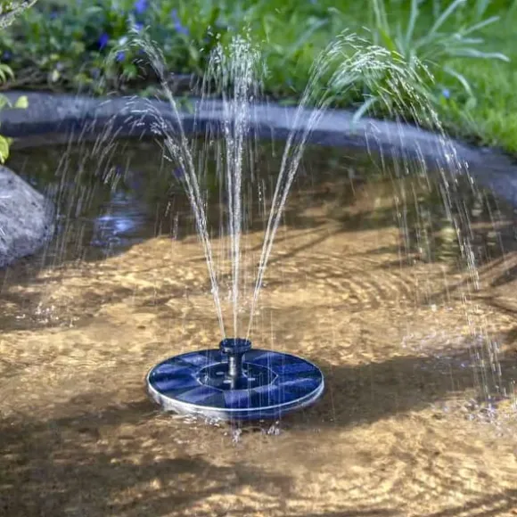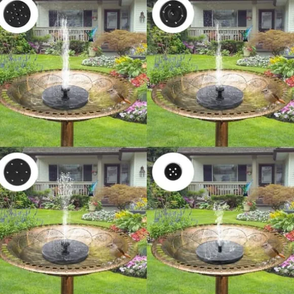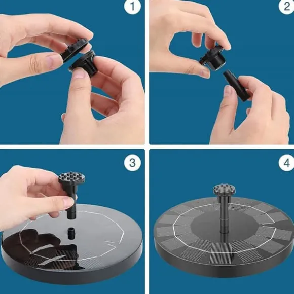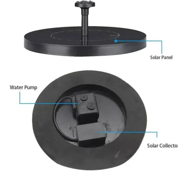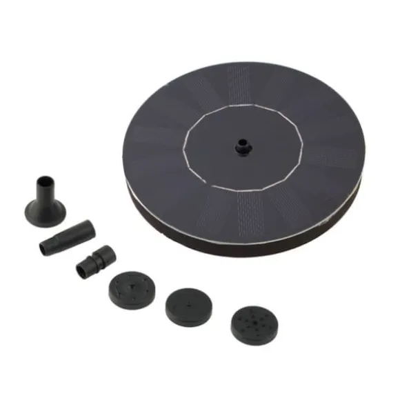 Solcellsfontän med vattenpump för Trädgård. En liten rund solcellsdriven fontän som ger nytt liv utomhus i din trädgård, fågelbadet eller i någon liten damm. Koppla in vattenpumpen på undersidan, välj sedan en av de 5 olika munstycken som du gillar bäst och placera den i vattnet, sen sköter den sig helt själv med hjälp av solenergi, direkt från solens strålar. Det betyder att inga batterier eller sladdar krävs, en otroligt miljövänlig solcellsfontän. Vattendjupet bör vara minst 2-3 cm för att den ska flyta.
