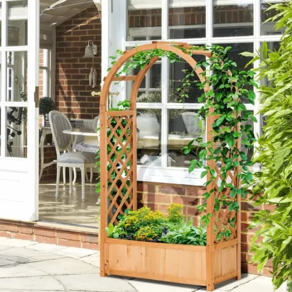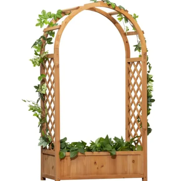 Planteringslåda i naturträ med båge och spaljéGe trädgården ett varmt, naturligt uttryck med denna planteringslåda i gran. Den rymliga lådan rymmer blommor, grönsaker och örter, medan den eleganta bågen och spaljéerna på sidorna ger perfekt stöd för klätterväxter och dekor.