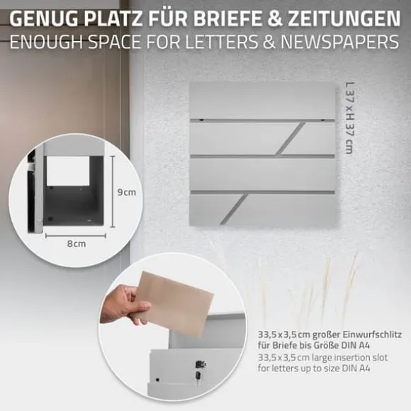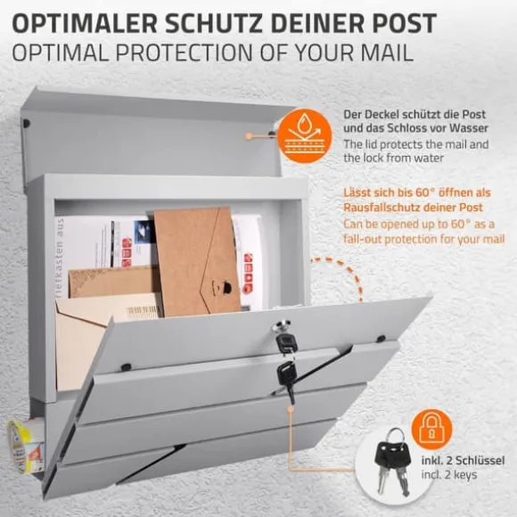 Din post förvaras säkert i den här moderna brevlådan. Din post kommer att hållas torr och ren i den här brevlådan. Tack vare insatsen, som skyddas av den helt stängbara klaffen, kan varken fukt eller smuts tränga in i brevlådan. Brevlådan är också låst med ett cylinderlås. Denna brevlåda rymmer inte bara din post, utan även dina tidningar, som kan förvaras i det integrerade tidningsfacket.