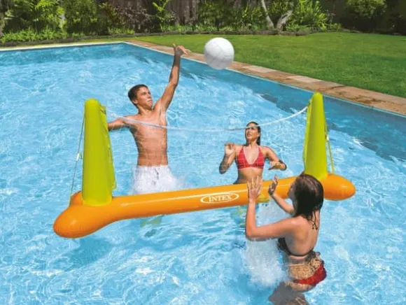 Stor uppblåsbar poolvolleyboll + boll INTEX 56508 Ett set för att spela volleyboll i poolen är en bra idé för ett aktivt sätt att tillbringa din fritid. Att leka tillsammans för barn och vuxna kommer inte bara att integrera familjen, utan också ge mycket motion, rekommenderat för alla åldrar. Setet innehåller en uppblåsbar boll. Nätbasen har anpassats för att fästa vikter som håller nätet på en fast plats vid behov. Huvudfunktioner: uppblåsbar volleybollboll ingår idealisk för poolreparationsplåstret medföljer Tekniska data: Mått 239 x 64 x 91 cm PVC-tjocklek 0,25 mm PVC-tjocklek på bollen 0,18 mm