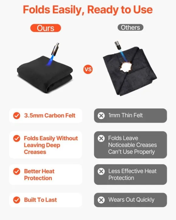 Överlägsen värmetålighet Med motstånd upp till 982 °C fungerar filten som en effektiv barriär mot värmestrålning och direkt kontakt från gnistor och sprut, vilket minskar risken för skador på omgivande ytor.