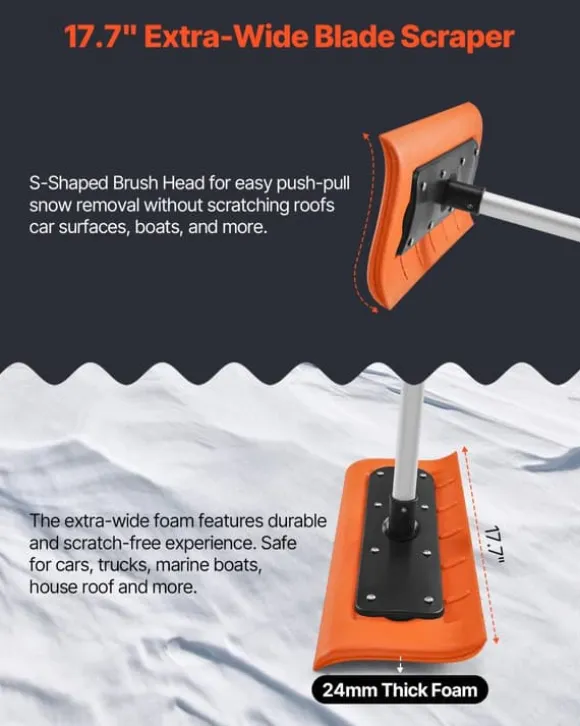 Rensa taket snabbt och säkert med en lätt, justerbar snökratta som täcker stora ytor i varje drag. Det extra breda skumbladet skyddar takytor, medan det robusta handtaget i aluminiumlegering ger stabilitet och lång livslängd – perfekt för snö och löv på hus-, garage- och biltak.