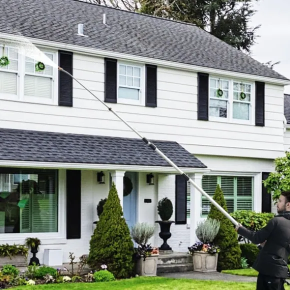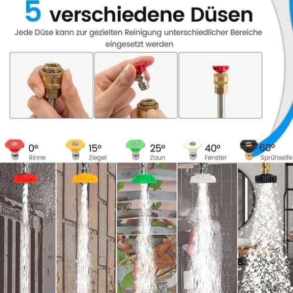 Den 5-delade teleskopstaven garanterar en omfattande rengöringsupplevelse. Vrid helt enkelt låshylsorna och förläng varje sektion till önskad längd. Hela setet, i kombination med 15° förlängningsstaven och tillbehöret för rännrengöring, kan nå ett avstånd på upp till 550 cm. De fem olika sprutmunstyckena gör att du kan justera sprutvinkeln snabbt och enkelt, tack vare 0,6 cm snabbkoppling. Denna funktion gör den idealisk för användning på en mängd olika ytor, inklusive betong, trä och glas.