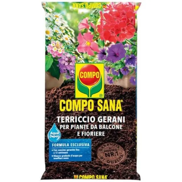 Jord som består av torv av högsta kvalitet från Nordeuropa, idealisk för pelargoner och blommor som begonia, petunia, ciclamen, prästkragar, primula, surfinias, etc. på balkongen eller i krukor. Med COMPO AQUA DEPOT, den utmärkta vattenhållaren, som absorberar och behåller en del av det vatten som ges under vattningen och sedan släpper ut det enligt växternas behov. Detta minskar vattenavdunstningen och, som en följd, antalet vattningar. Med snabbverkande och långsamt frisättande gödningsmedel för en ännu mer balanserad näring upp till 12 veckor. Större och hälsosammare växter tack vare blandningen av mikronäringsämnen. Med perlitskivor av naturlig vulkansten för att göra strukturen mer luftig och porös, samt för att ge optimal vattenhållning. Med COMPO:s rotaktiverare för en perfekt utveckling av rotsystemet på djupet, vilket möjliggör bättre upptag av vatten och näringsämnen. Rekommenderad användning från mars till oktober. Applicering rekommenderas i balkonger/krukor. Säcken innehåller 20 liter.