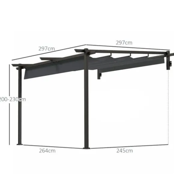 – Pergolans totala mått: 297 L x 297 B x 200/230 H cm. Avstånd mellan stöden: 264 L x 245 B cm