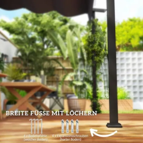 – För alla underlag: Oavsett om det är mjukt eller hårt underlag står denna paviljong stadigt och säkert tack vare de fyra markpinnarna och fyra expansionsskruvarna