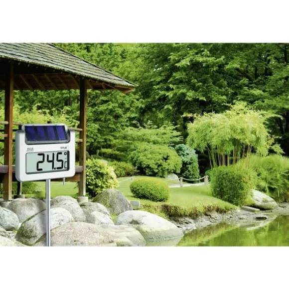 with solar lighting via light sensor and time switch, large digital display with 3 different modes: 1. current temperature 2. current temperature and clock in sequence 3. current, highest and lowest temperature and time in sequence auto reset of maximum and minimum value, rod (separable) in aluminium, weather resistant