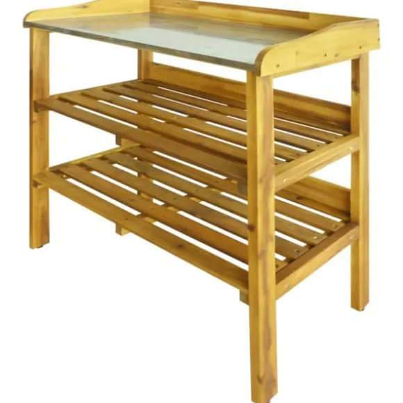 Odlingsbänken har 2 hyllor med gott om plats för att ha dina trädgårdsverktyg på och inom räckhåll medan du planterar eller för att förvara färdiga krukor. Bordsskivan i zink är lättsam att rengöra och har en vattenbeständig yta men bidrar även till bänkens rustika känsla.