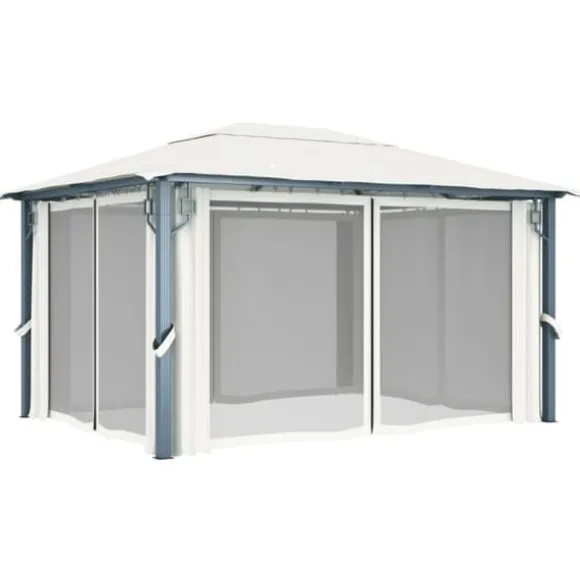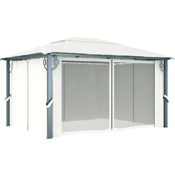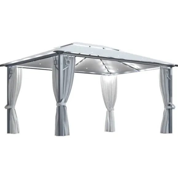 Taket, tillverkat i oxfordtyg med PA-beläggning, skyddar dig mot skadliga UV-strålar i direkt solljus. Paviljongen är massivt tillverkad av stark aluminium och starkt stål och är därför resistent mot rost och mycket stabil. Paviljongen levereras med 4 sidoväggar som kan användas vid dåligt väder. Nätskärmar ingår också för att hålla insekter borta men samtidigt låta luften cirkulera. Kardborrefästen ingår också för enkel fastsättning av draperierna. Dessutom skapar ljusslingan en mysig atmosfär i din trädgård när solen går ner. Ljusslingan förorenar inte miljön eftersom den laddas av solenergi under dagen.