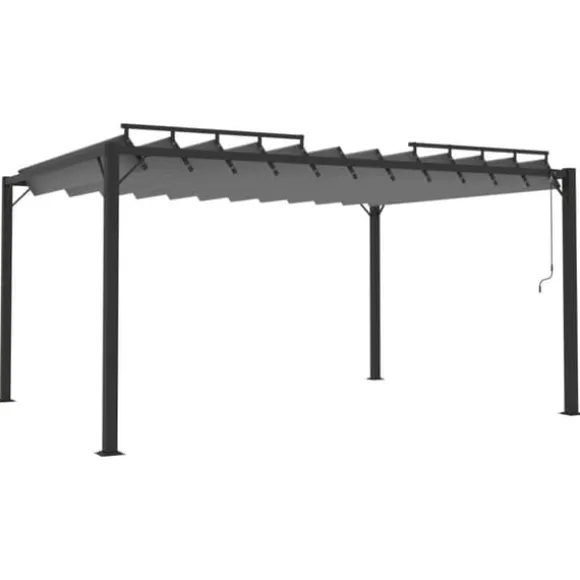 Denna paviljong är tillverkad i PA-behandlat tyg som är vatten- och smutsavvisande. Den starka aluminiumramen gör paviljongen stadig och mycket hållbar. Paviljongen har ett justerbart lamelltak. Lamellerna kan enkelt vridas och justeras till rätt position med handveven. Öppna dem när du vill njuta av solen och stäng dem för att få skugga eller skydd mot regn. Paviljongen är ett perfekt val för utomhusaktiviteter.