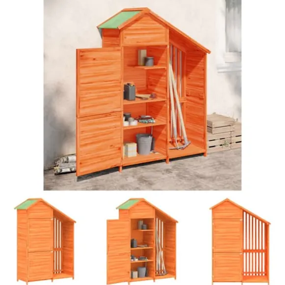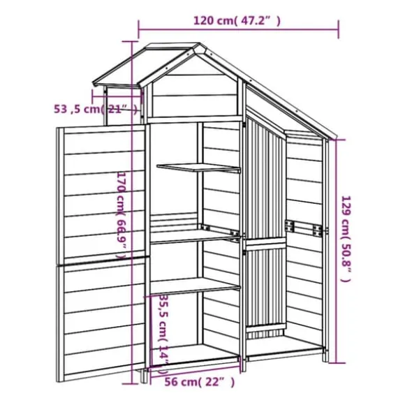 - Stort och organiserat utrymme: Denna träbod är perfekt utformad för olika trädgårdsredskap, gräsklippningsutrustning, pooltillbehör och redskap som kvastar, krattor etc.