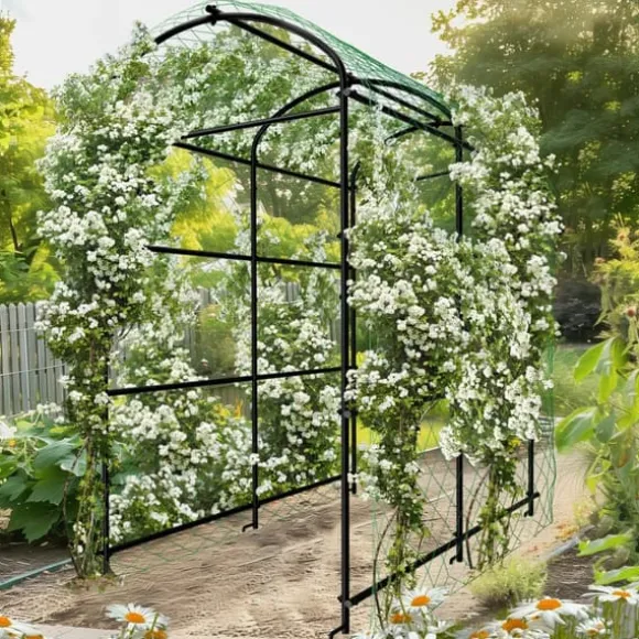 Stabilt trädgårdsspaljé för kraftiga klätterväxterDetta U-formade spaljé (160 cm högt) ger pålitligt stöd för bönor, gurkor, tomater och blommande klättrare. En vit, pulverlackerad metallram med nylon-nät och jordspett ger lång hållbarhet och ordnad, platsbesparande odling.