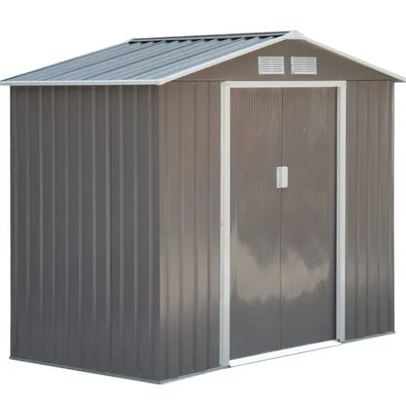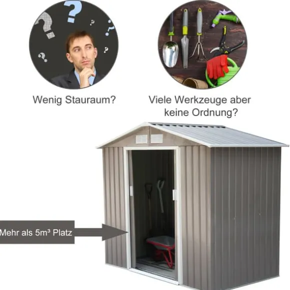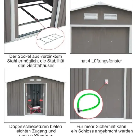 Detta väderbeständiga trädgårdsskjul erbjuder en robust och rymlig förvaringslösning för dina trädgårdsredskap och utrustning. Dess robusta metallkonstruktion garanterar hållbarhet, medan skjutdörrar ger enkel åtkomst och inbyggda fönster släpper in naturligt ljus och ventilation. Perfekt för att organisera din utomhusmiljö och skydda dina tillhörigheter mot väder och vind.