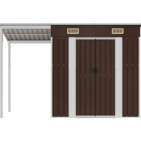 - Godt om förvaringsutrymme: Denna metallbod erbjuder gott om plats för att förvara ved, trädgårdsverktyg, möbler, utrustning och mer. Den har också ett förlängt tak för förvaring av ved. Taket kan fästas på vardera sidan av skjulet.