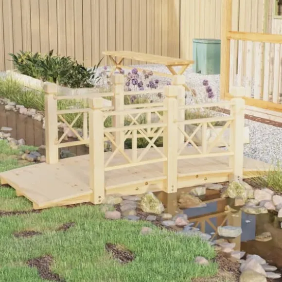 - Massivt granträ: Trädgårdsbron är tillverkad av massivt granträ som är hållbart och stabilt.