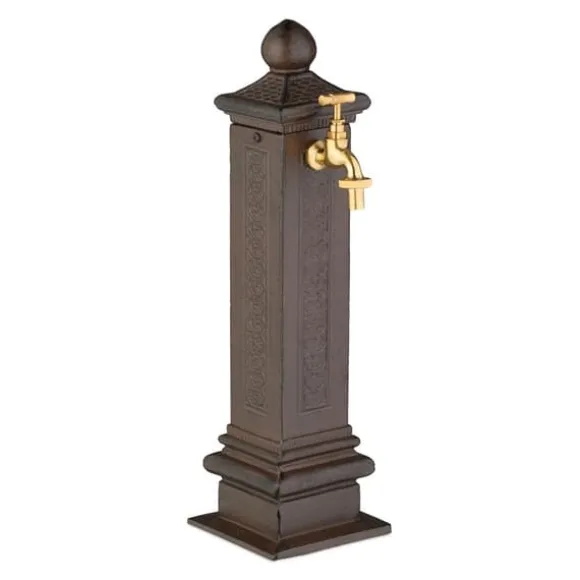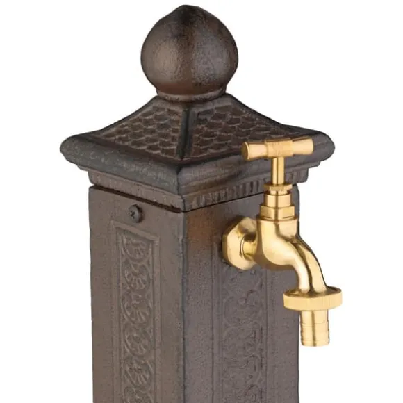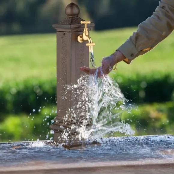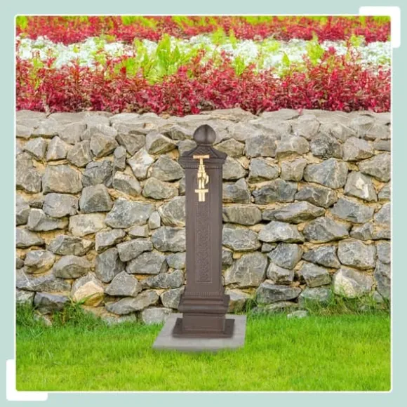 Lägg till en touch av nostalgisk charm i din trädgård eller på din uteplats med denna antikstilade kolonnfontän, perfekt för dekorativt bruk eller praktiska uppgifter som att tvätta händerna och vattna växter. Den eleganta designen har en gyllene kran och en smart dold vattenanslutning, vilket gör den både stilren och funktionell. Säkra monteringsalternativ garanterar stabilitet på stenplattor för långvarig njutning.