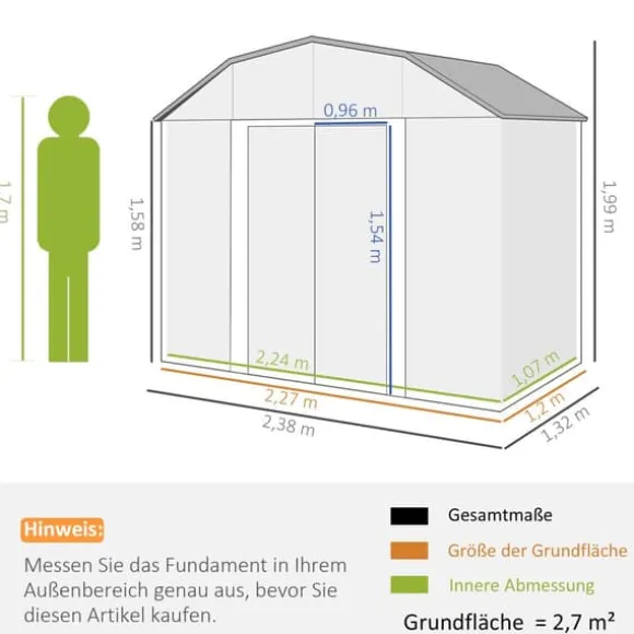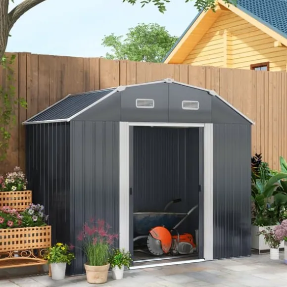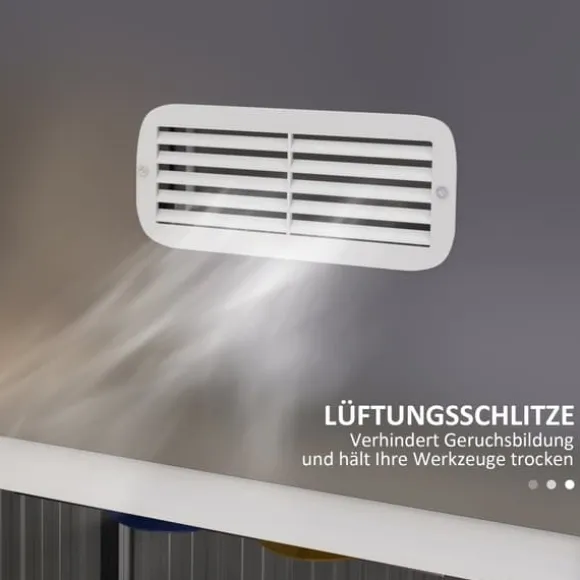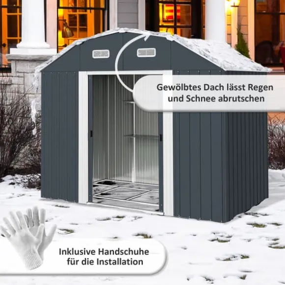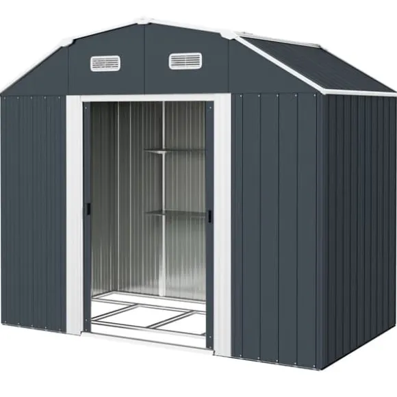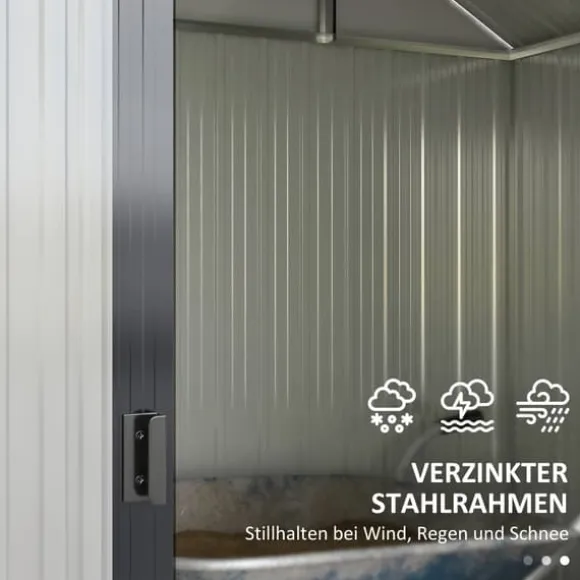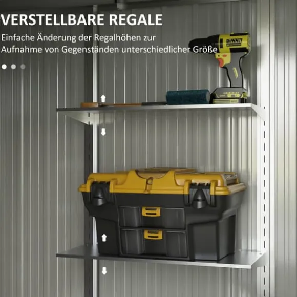 Detta trädgårdsförråd i stål erbjuder en praktisk och säker förvaringslösning för din utomhusutrustning, skyddar dem från väderskador samtidigt som det håller en torr och ventilerad interiör. Dess justerbara hyllor och skjutdörrar ger enkel åtkomst och flexibel organisering, vilket gör det idealiskt för att hålla trädgårdsverktyg och tillbehör prydligt förvarade.