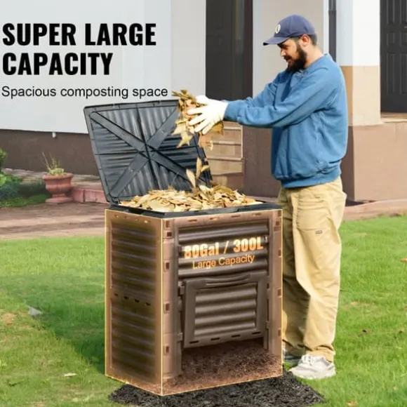 Tillräckligt med lagringsutrymme: Med en lagringskapacitet på upp till 300 liter kan denna stora kompostbehållare för utomhusbruk rymma en betydande mängd material, vilket minskar frekvensen av arbetsuppgifter. Den är perfekt för lagring och transport av kompost eller trädgårdsavfall.