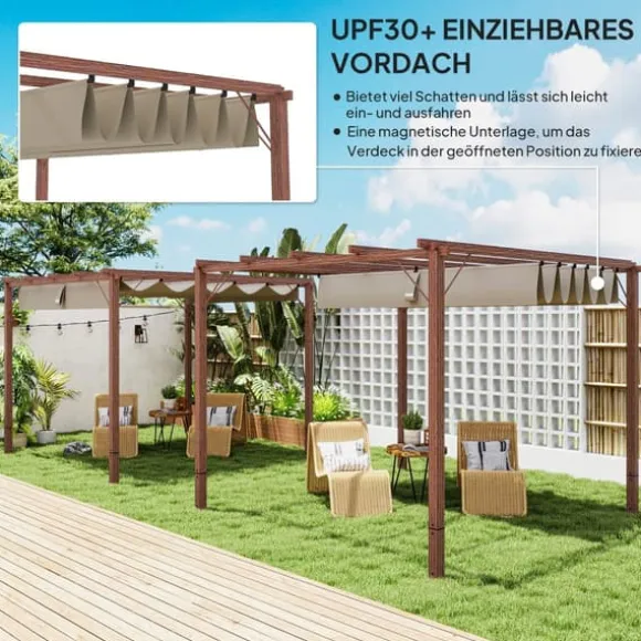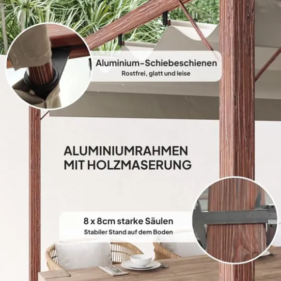Denna fristående trädgårdspergola har ett utdragbart tak som gör att du kan njuta av sol eller skugga efter önskemål och ger pålitligt UV-skydd. Dess robusta aluminiumram med naturlig trästruktur tillför charm och stabilitet, vilket gör den idealisk för terrasser och trädgårdar.