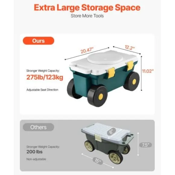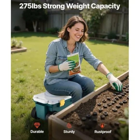 Denna 2-i-1 rullande trädgårdsscooter med säte erbjuder en bekväm och praktisk lösning för trädgårdsarbete, vilket gör att du kan utföra lågt liggande uppgifter som plantering och ogräsrensning utan att belasta rygg eller knän. Den lätta designen, det rymliga förvaringsutrymmet och den robusta konstruktionen gör den idealisk för både inomhus- och utomhusarbete. De stora hjulen och det inbyggda handtaget säkerställer enkel manövrering över olika underlag.