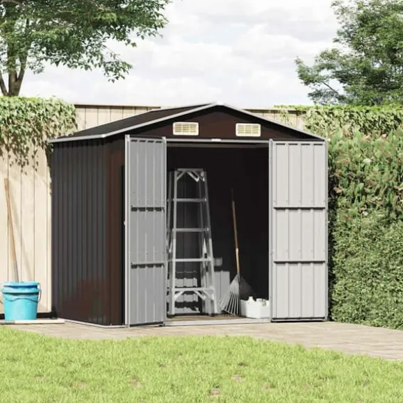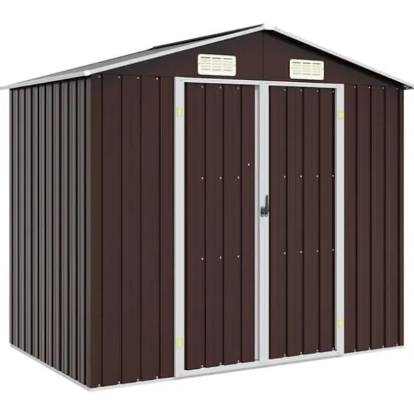 Detta förråd är utrustat med ventiler, utformade som jalusier för att hålla regnet borta. Det ger också ventilation hela tiden för att minska ansamling av fukt och lukt i huset. Denna utomhusbod är tillverkad av galvaniserat stål, kräver minimalt underhåll och är mycket hållbar. De dubbla öppningsdörrarna framtill gör det enkelt att komma in och ut. Regnvatten dräneras automatiskt från taket med sin sluttande design.