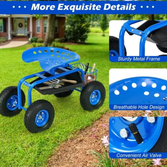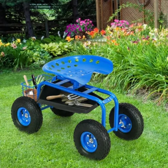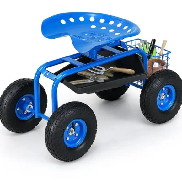 Denna trädgårdsvagn har en robust, rostbeständig stålkonstruktion med en ergonomisk, höjdjusterbar sits som roterar 360 grader för bekväm användning. Den inkluderar en verktygshållare och förvaringskorg, stora gummihjul för stabilitet och är enkel att montera, vilket gör den idealisk för trädgårdsarbete, bilreparation eller allmän förvaring.