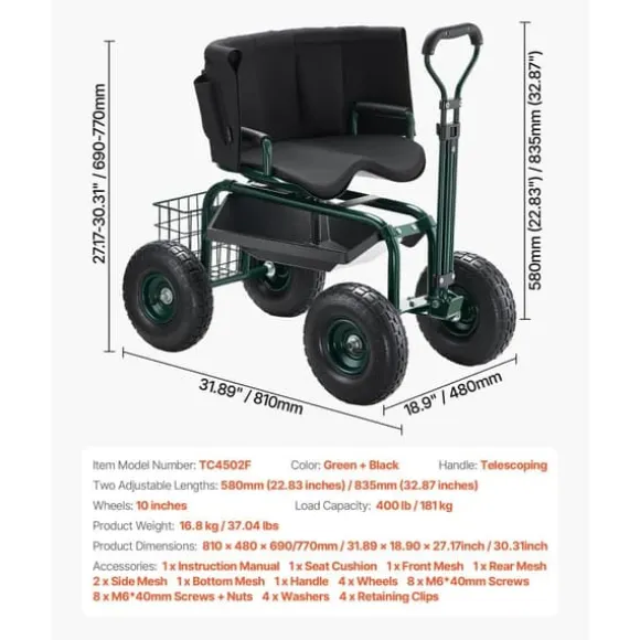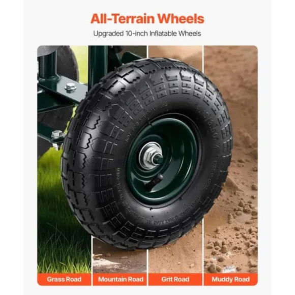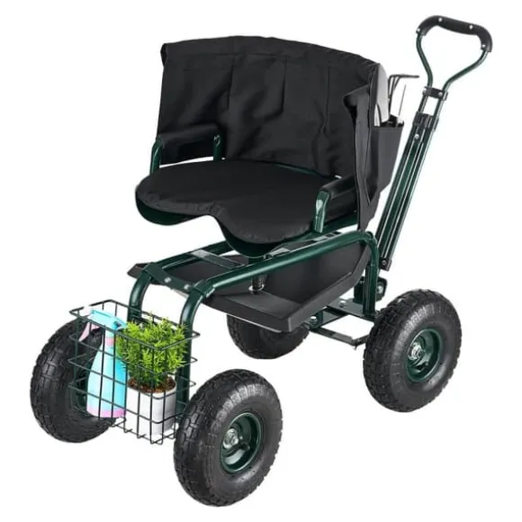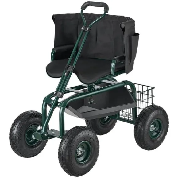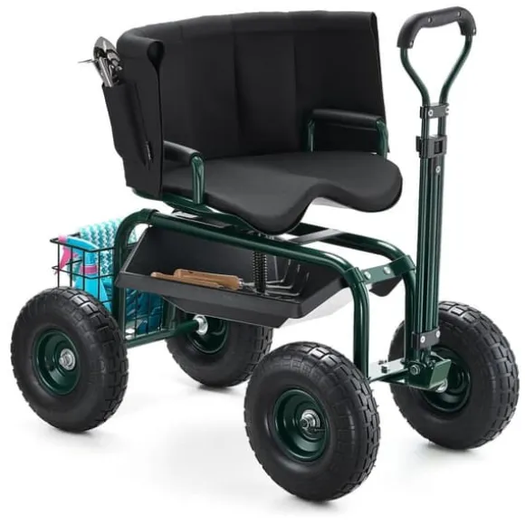 De 25 cm uppblåsbara terrängdäcken absorberar stötar och möjliggör smidig körning på ojämn mark. Den 360° roterande sitsen ger enkel manövrering och ergonomisk komfort för långa arbetspass. Den robusta konstruktionen stödjer upp till 180 kg och har en avtagbar verktygslåda för enkel förvaring. Denna trädgårdsvagn uppfyller alla behov för trädgårdsarbete och andra utomhusuppgifter.