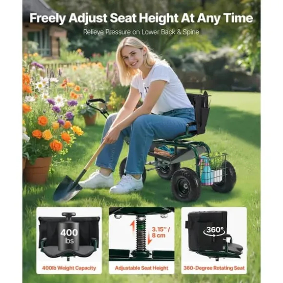 Denna rullande trädgårdsvagn med säte är det perfekta redskapet för trädgårdsarbete och andra utomhusuppgifter. Den är utrustad med 25 cm terrängdäck för en smidig körning på ojämn terräng, en 360° roterande sits för enkel manövrering och en robust konstruktion för att stödja upp till 180 kg.