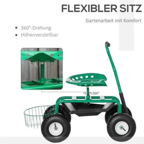 – TRÄDGÅRDSVAGN: Kombinationen av trädgårdsvagn och sittplats underlättar trädgårdsarbetet och förebygger smärta i knän och rygg. Framhjulet kan styras med hjälp av styret för att enkelt ändra körriktningen.