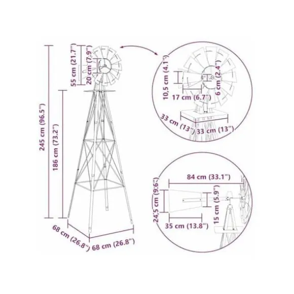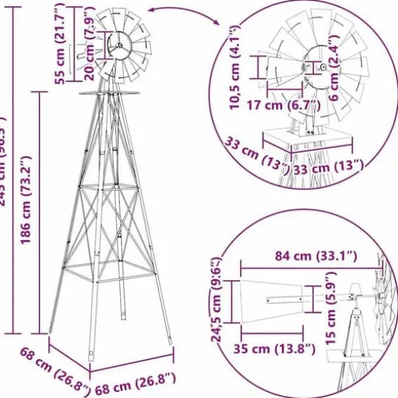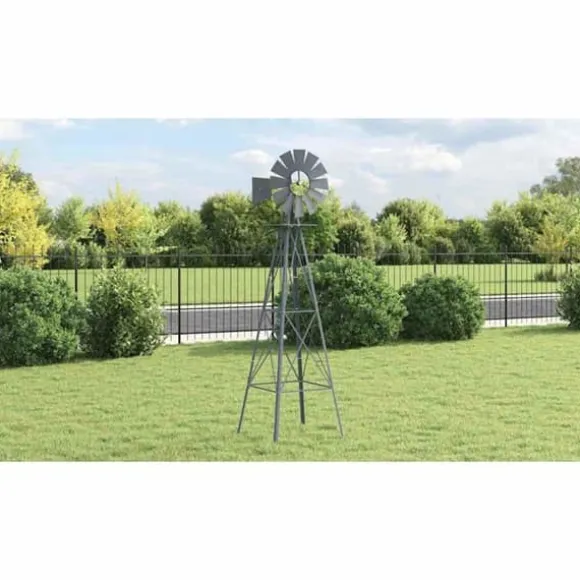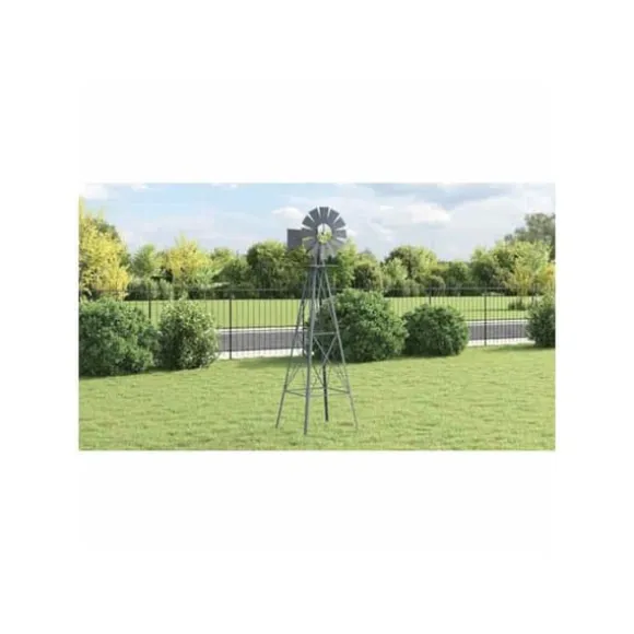 VidaXL:s vindkraftverk är en trädgårdsprydnad som är utformad för att ge en industriell touch till ditt utomhusutrymme. Tillverkad av robust järn är den konstruerad för att motstå väder och rost, vilket garanterar en exceptionell hållbarhet. Med måtten 84 x 68 x 245 cm är detta vindkraftverk en imponerande skulptur som drar blickarna till sig. Med en vikt på 10,45 kg är den tillräckligt tung för att förbli stabil, även vid kraftig vind. Dess struktur förstärks av stödstag och markspett, vilket säkerställer ökad stabilitet. Lagret är designat för att vara smidigt, vilket gör att vindkraftverket kan snurra lätt med vinden. Denna produkt är avsedd för utomhusbruk och kräver montering. Den är idealisk för den som vill försköna sin trädgård med en funktionell dekorativ detalj. Vindkraftverket levereras med alla nödvändiga delar för installation. Dess grå färg och design i järn ger den ett modernt och stilrent utseende som passar perfekt i olika stilar av utomhusdekoration.