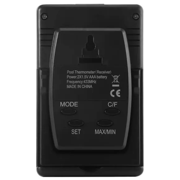 1. Multifunktionell termometer: Pooltermometern kan konfigureras med temperaturlarm och snoozelarm, och visar temperatur, månad, vecka, tid och mottagningskanal.